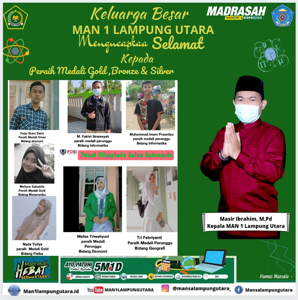 LAMPUNG UTARA, MAN 1 (Humas)– MAN 1 Lampung Utara meraih tujuh medali di Pusat Olimpiade Sains Indonesia (POSI) 2021, dengan perincian dua emas, satu perak dan empat perunggu.