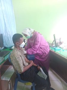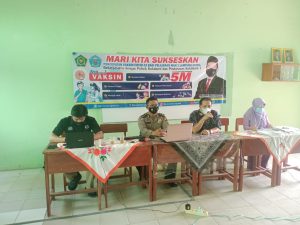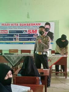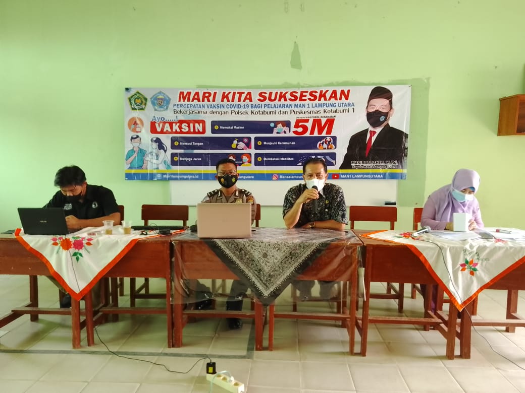 Lampung Utara, MAN 1 (Humas) — Rabu, 27 Oktober 2021. Menindaklanjuti Surat Edaran Kementerian Agama Lampung Utara tentang Pembelajaran Tatap Muka Terbatas (PTM-T), Siswa Madrasah Aliyah Negeri (MAN) 1 Lampung Utara secara bertahap masuk kembali mulai Agustus 2021 setelah sekian lama belajar daring dari rumah dengan di bagi dua sesi. Sebagai bentuk dukungan MAN 1 Lampung Utara terhadap upaya pemerintah dalam memutus rantai penyebaran virus covid-19 tersebut, kepala madrasah mewajibkan seluruh civitas akademika MAN 1 Lampung Utara untuk melakukan vaksin. Bermula dari vaksinasi seluruh pendidik, tenaga kependidikan serta siswa siswi yang diselenggarakan atas kerjasama Polsek Kotabumi Kota, Puskesmas Kotabumi 1 dan MAN 1 Lampung Utara beberapa waktu lalu (Senin, 20 September 2021), hari ini dilaksanakan vaksin 1 dan 2 untuk pendidik, tenaga kependidikan serta siswa siswi MAN 1 Lampung Utara dengan kuota vaksin sebanyak 250 orang.