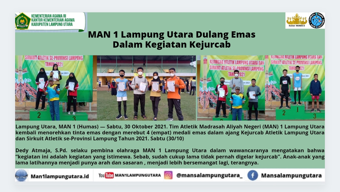 Lampung Utara, MAN 1 (Humas) — Sabtu, 30 Oktober 2021. Tim Atletik Madrasah Aliyah Negeri (MAN) 1 Lampung Utara kembali menorehkan tinta emas dengan merebut 4 (empat) medali emas dalam ajang Kejurcab Atletik Lampung Utara dan Sirkuit Atletik se-Provinsi Lampung Tahun 2021. Sabtu (30/10)