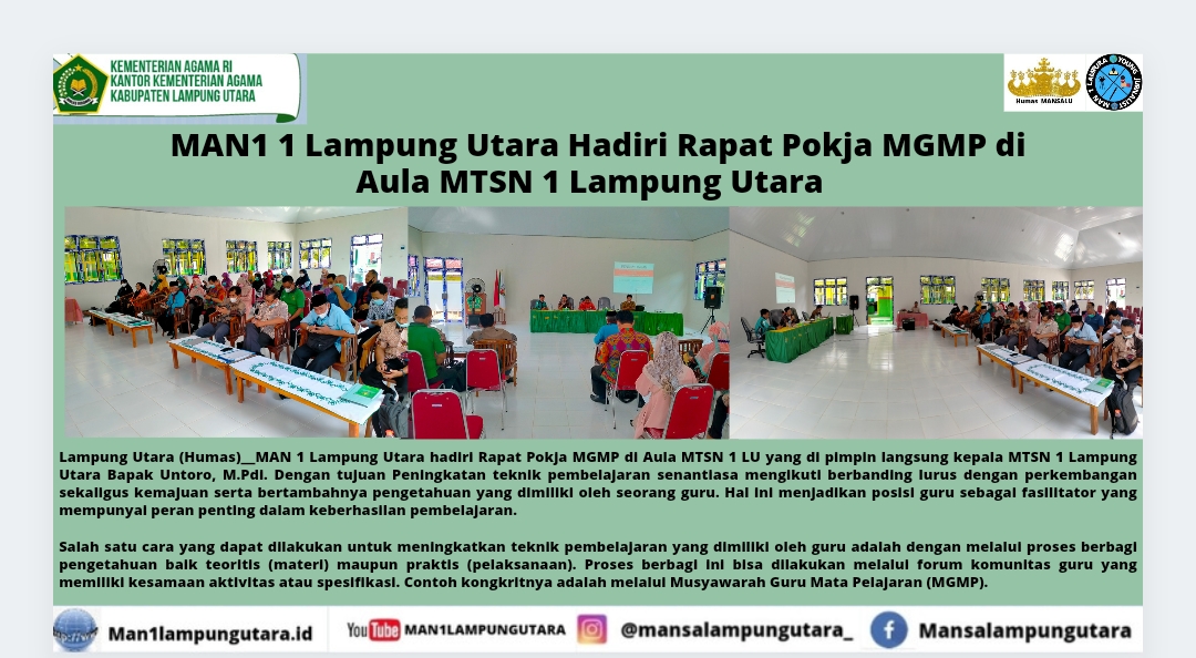 Lampung Utara, MAN 1 (Humas)– Madrasah Aliyah Negeri (MAN) 1 Lampung Utara hadiri Rapat Pokja MGMP di Aula Madrasah Tsanawiyah Negeri (MTs) 1 Lampung Utara yang di pimpin langsung kepala MTSN 1 Lampung Utara Bapak Untoro, M.Pd.I. Dengan tujuan Peningkatan teknik pembelajaran senantiasa mengikuti berbanding lurus dengan perkembangan kemajuan serta bertambahnya pengetahuan yang dimiliki oleh seorang guru. Hal ini menjadikan posisi guru sebagai fasilitator yang mempunyai peran penting dalam keberhasilan pembelajaran.