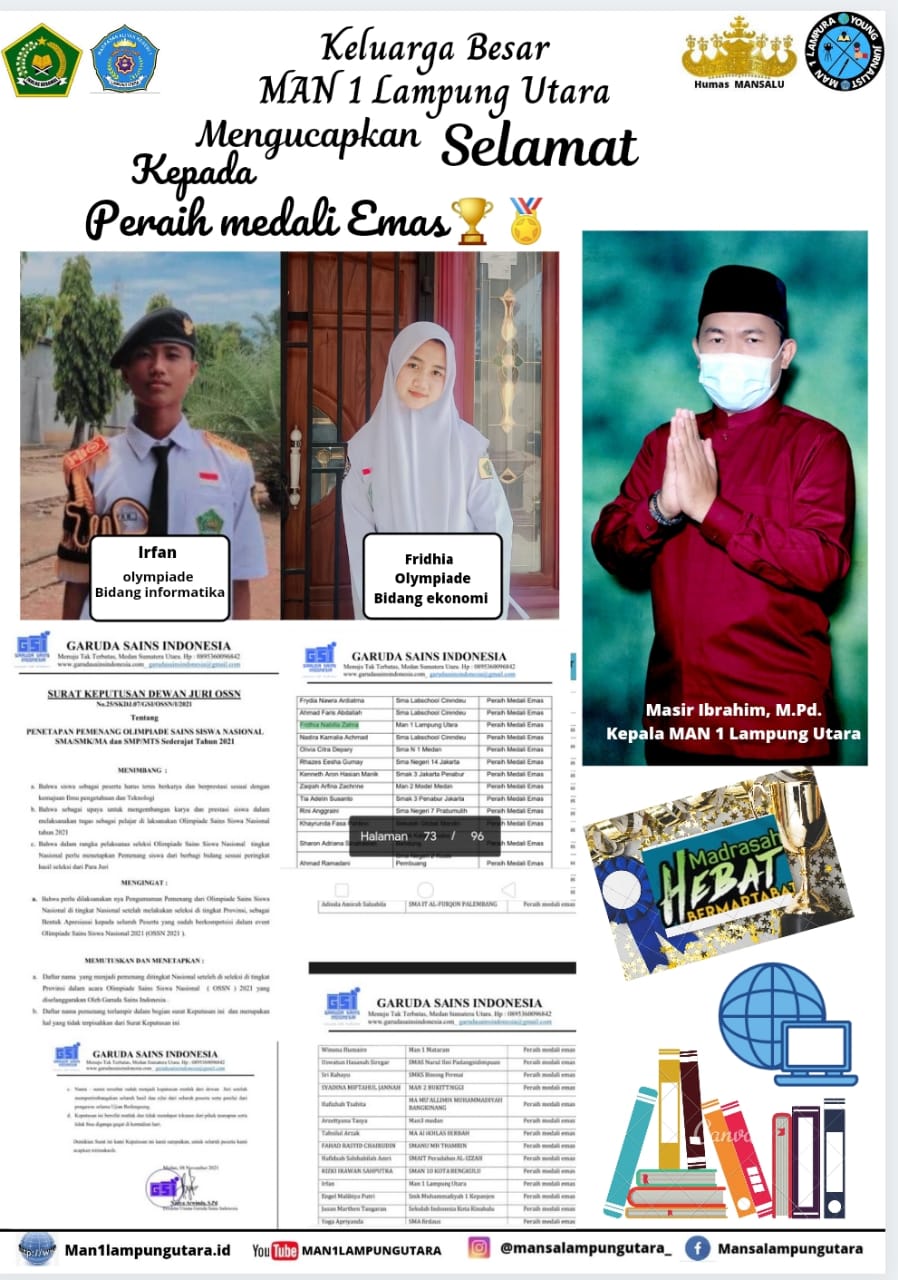 Lampung Utara, MAN 1 (Humas) – Senin, 08 November 2021. Siswa Madrasah Aliyah Negeri (MAN) 1 Lampung Utara meraih medali emas bidang Informatika dan ekonomi tingkat SMA/Sederajat dalam kegiatan Olympiade Sains Siswa Nasional (OSSN) 2021 yang diselenggarakan oleh Garuda Sains Indonesia. Senin (8/11)