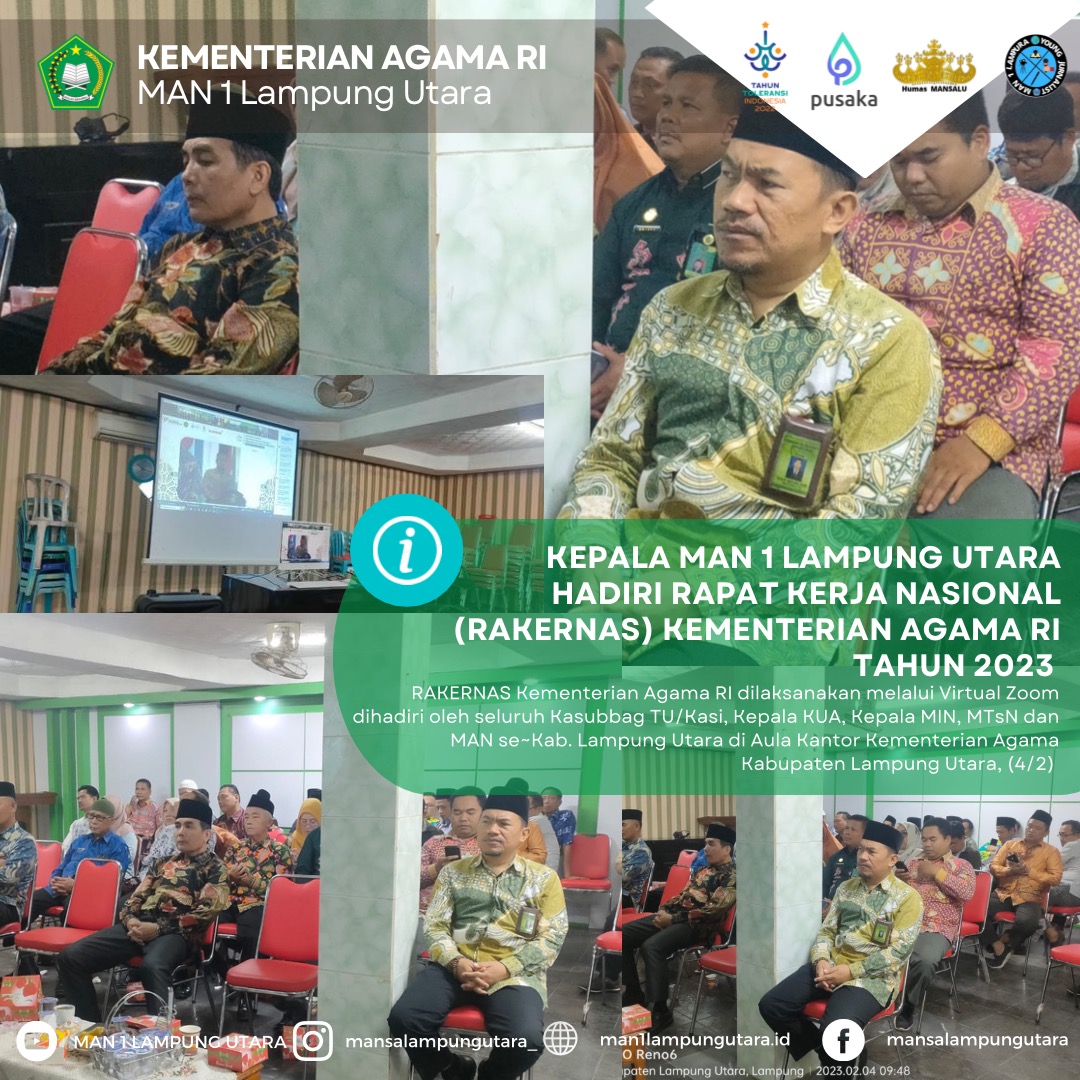 Lampung Utara, MAN 1 ( Humas ) – Kepala Madrasah Aliyah Negeri (MAN) 1 Lampung Utara Masir Ibrahim, M.Pd., mengikuti secara daring melalui Zoom Meeting Rapat Kerja Nasional (RAKERNAS) Kementerian Agama Republik Indonesia pada hari Sabtu, 03 Februari 2023.