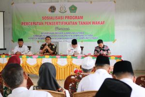 Lampung Utara, MAN 1 (Humas)-Dalam rangka untuk meningkatkan pelayanan pada Kantor Kementerian Agama Kabupaten Lampung Utara mengadakan sosialisasi Percepatan Persertifikatan Tanah Wakaf di kantor Kementerian Agama Lampung Utara bertempat di Aula Ponpes El Quro At Tholibin Abung Selatan. Tampak hadir Kepala Kemenag Kabupaten Lampung Utara, Drs. H. Totong Sunardi, MM., Kepala Kejaksaan Negeri (Kajari) Lampung Utara, Farid Rumdana SH. MH., Kepala Badan Pertanahan Nasional yang diwakili oleh Edi Lukman, Kasubbag Tata Usaha Kemenag Lampung Utara, H. Nang Sukarman, M.Pd.I. Kepala MAN 1 Lampung Utara, Masir Ibrahim, M.Pd. serta kepala-kepala Madrasah di lingkungan kemenag kabupaten Lampung Utara. Senin ( 20/03).