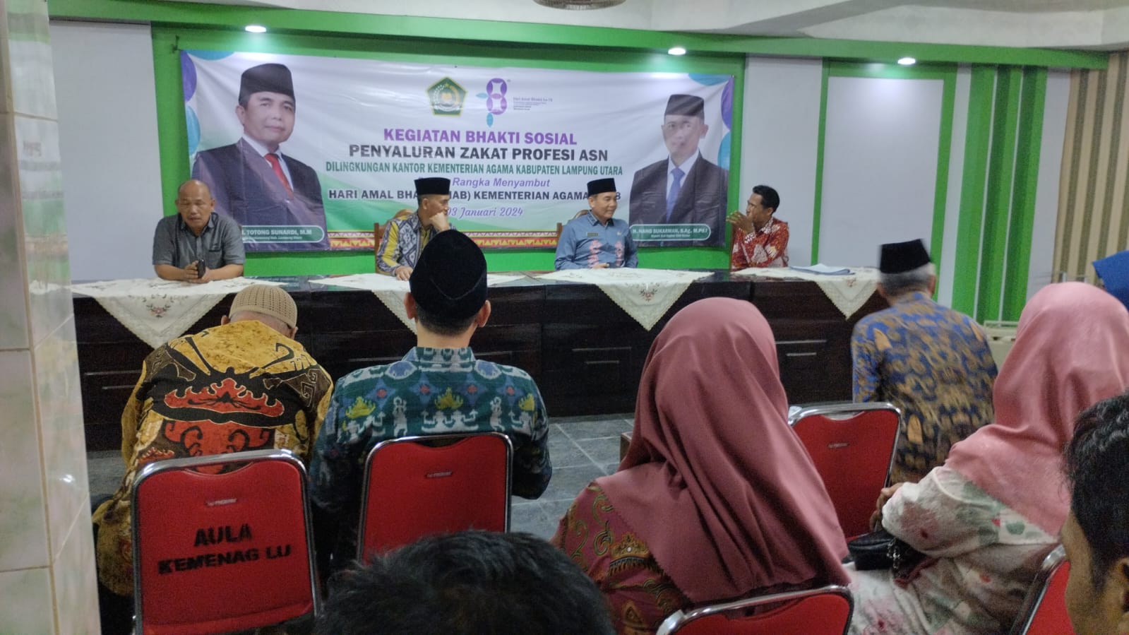 Lampung Utara, MAN 1 (Humas)—Kepala MAN 1 Lampung Utara yang dalam hal ini diwakilkan oleh Waka Sarpras, M.Nasir, S.Pd.I. menghadiri Kegiatan Bhakti Sosial Penyaluran Zakat Profesi ASN dilingkungan Kantor Kementerian Agama (Kemenag) Kabupaten Lampung Utara dalam rangka menyambut Hari Amal Bhakti (HAB) Kemenag ke 78 tanggal, 3 Januari 2024. Kamis (21/12).