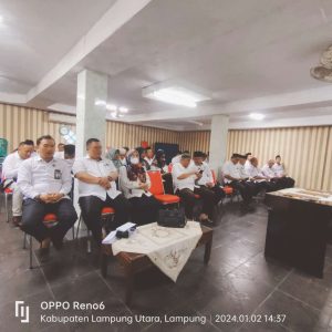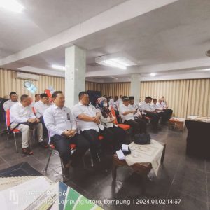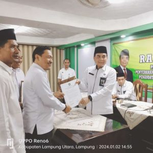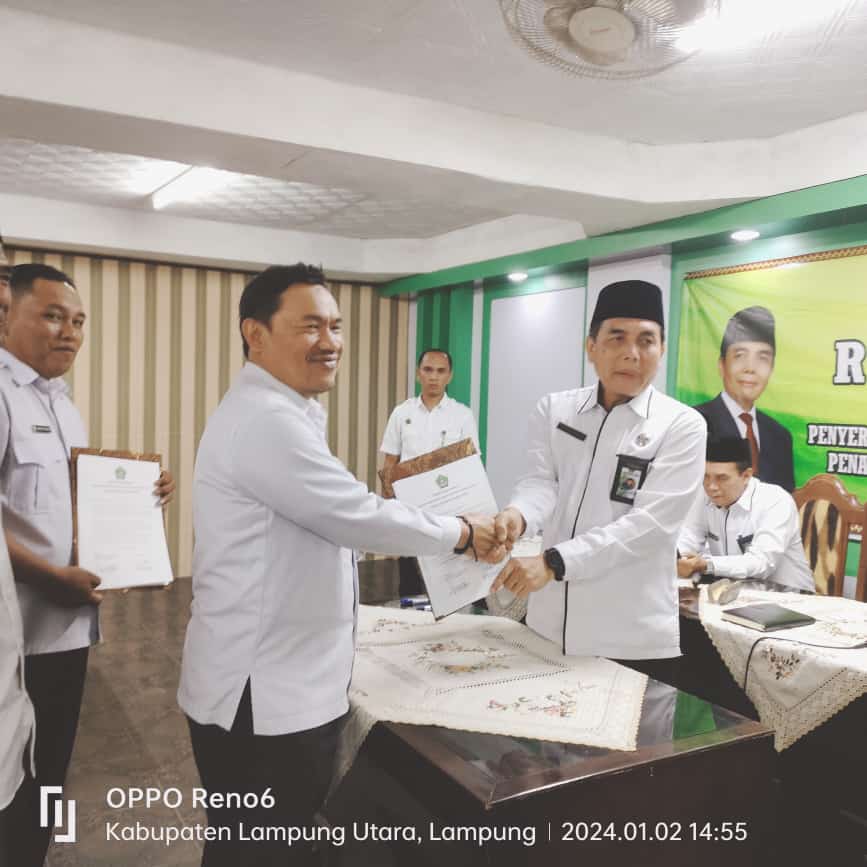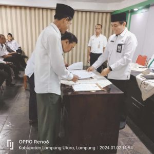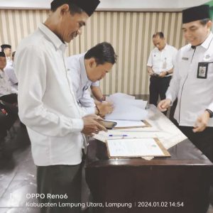 Lampung Utara, Humas (MAN 1) – Kepala MAN 1 Lampung Utara, Masir Ibrahim, M.Pd. menghadiri Rapat Koordinasi Penyesuaian Program Kerja dan Anggaran Tahun 2024, Penyerahan DIPA, penandatanganan Perjanjian Kerja dan Pakta Integritas Tahun 2024 di Aula Kementerian Agama (Kemenag) Kabupaten Lampung Utara. Selasa (02/01).