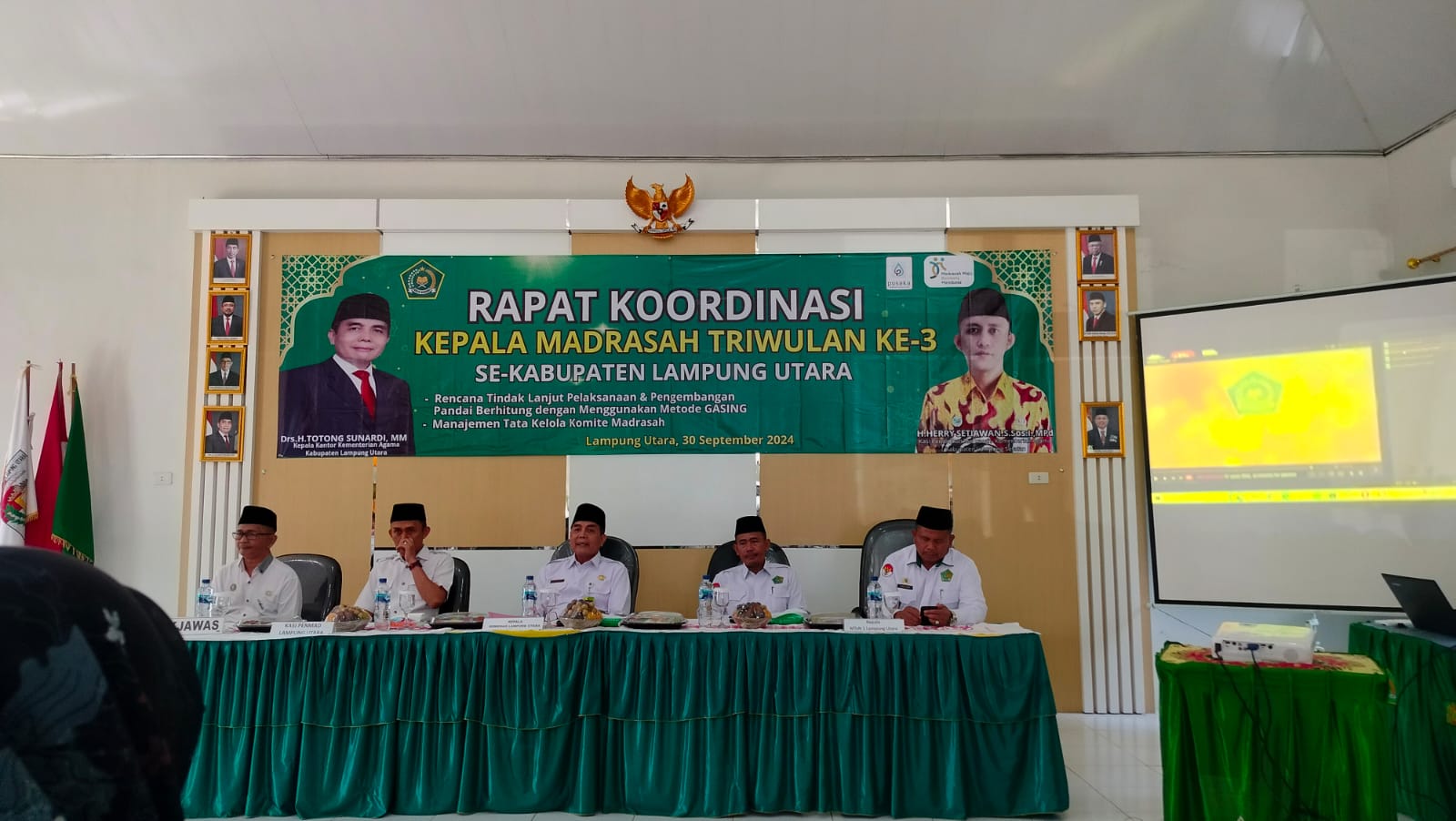 Rapat koordinasi ini dipimpin langsung oleh Kepala Kantor Kemenag Lampung Utara Drs. H. Totong Sunardi, M.M, memberikan pengarahan langsung terkait beberapa agenda pada rakor twiwulan 3 tahun 2024. Mengingat pentingnya rakor kali ini, setiap madrasah wajib untuk menghadiri dan menyimak serta menerapkan di madrasah masing-masing guna membentuk satu tujuan dan misi agar dapat berjalan beriringan untuk mencapai tujuan “Madrasah Hebat Madrasah Mendunia”, untuk itu acara ini dihadiri oleh seluruh Kepala RA, MTs dan MA se-Kabupaten Lampung Utara (atau yang mewakili).