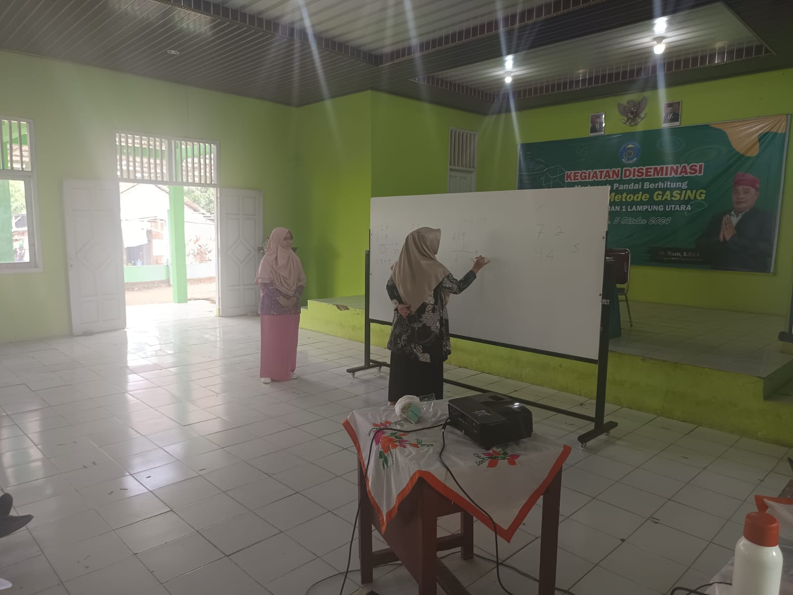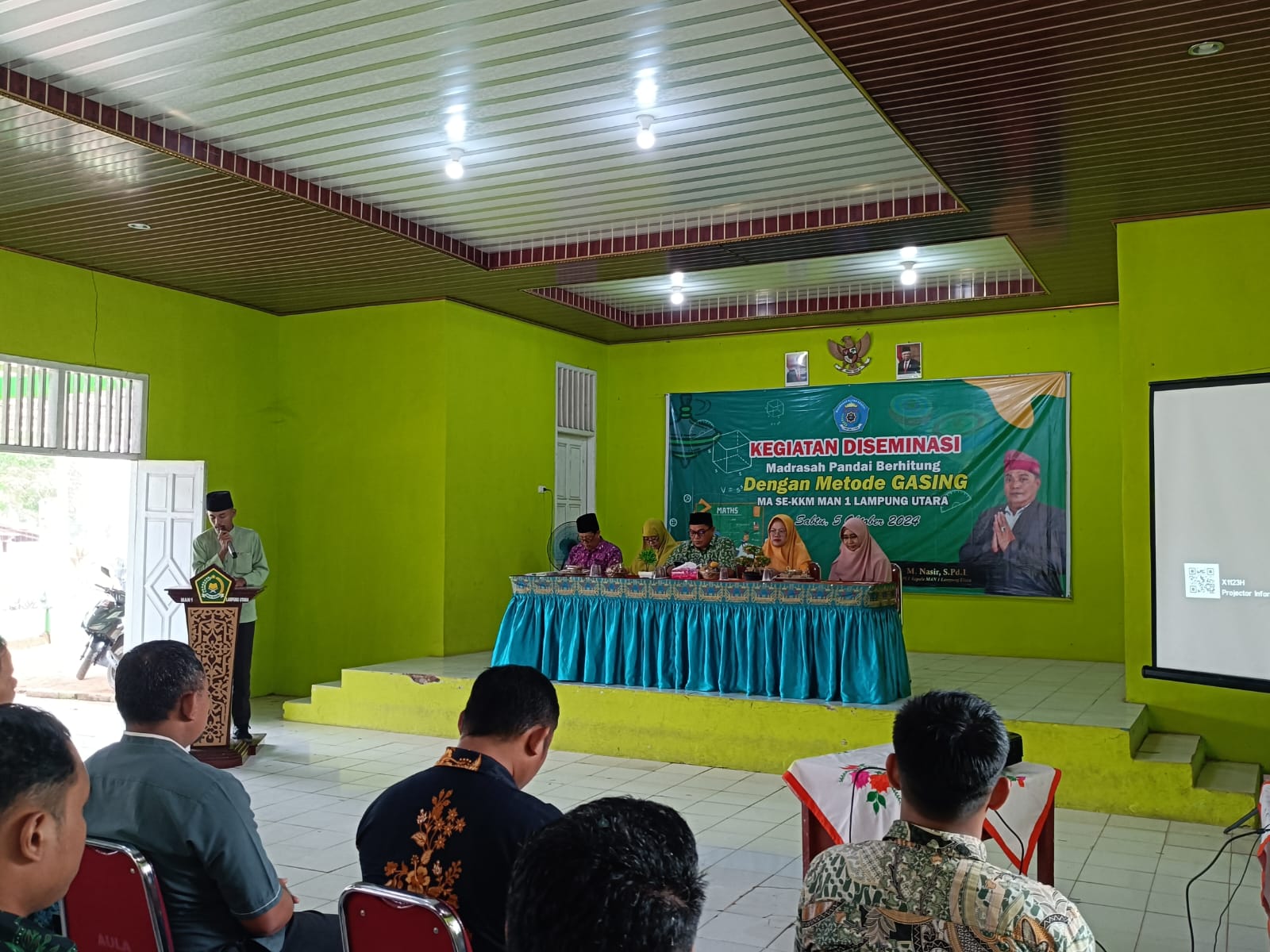 Kegiatan Diseminasi Madrasah Pandai Berhitung dengan Metode GASING dihadiri dan dibuka langsung oleh Pengawas Pembina Kementerian Agama Kabupaten Lampung Utara, Marita Sari, M.Pd; diiringi oleh Plt. Kepala MAN 1 Lampung Utara, M. Nasir, S.Pd.I; Pemateri Metode GASING, Yeni Agustina, S.Pd dan Azimah, S.Pd; beserta Seluruh Guru Matematika MA Se-KKM MAN 1 Lampung Utara.