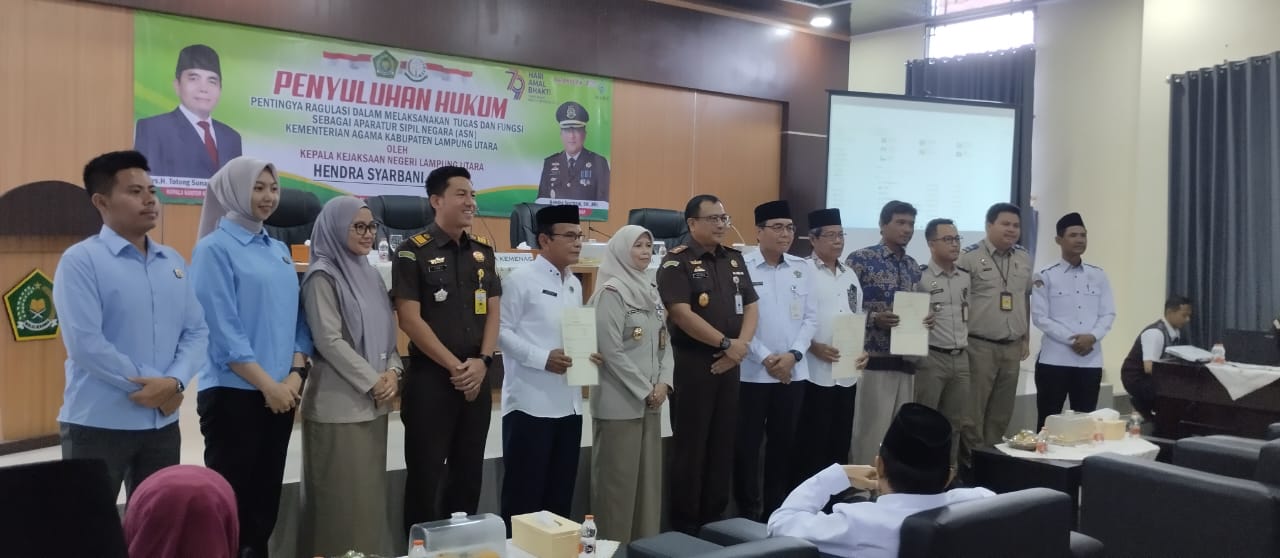 Kegiatan ini diikuti oleh para Pejabat Kemenag Lampung Utara, Kasi Datun Kejari beserta jajarannya, Kepala BPN beserta jajarannya, Ketua DWP, Kapokjaluh, Ketua IGRA dan K3RA, Ketua APRI dan IPARI.