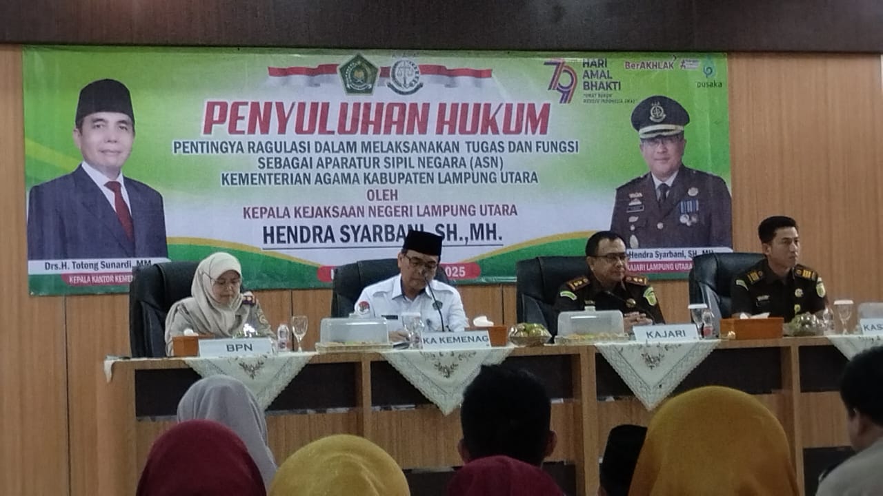 Dalam sambutannya, Kepala Kemenag Kabupaten Lampung Utara, Totong Sunardi, M.M., memberikan apresiasi dan ucapan terimakasih kepada Kepala Kejaksaan Negeri Lampung Utara dan para tamu undangan yang telah bersedia membersamai untuk berbagi ilmu dalam kegiatan ini. Hal tersebut menjelaskan bahwa Kantor Kemenag Lampung Utara menunjukan bukti nyata berupa MOU kerja sama antar instansi Kejari dan BPN dengan baik. Ucap Totong.