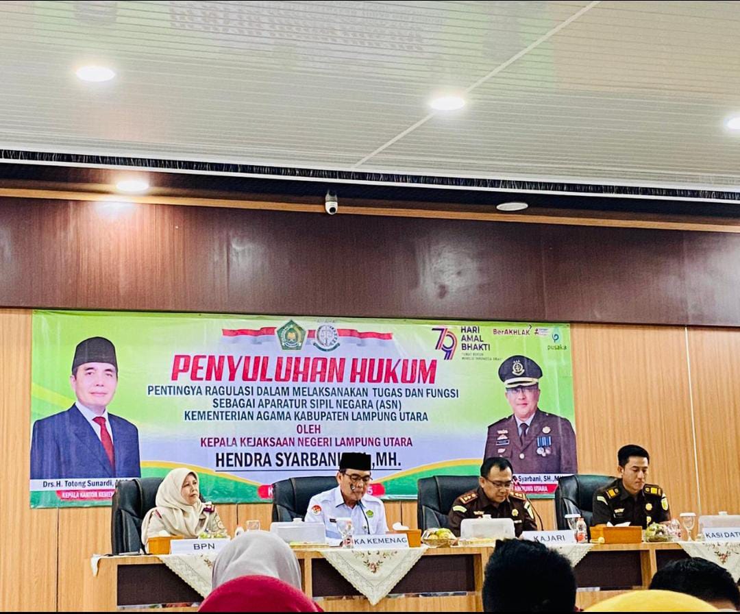 Dalam sambutannya, Kepala Kemenag Kabupaten Lampung Utara, Totong Sunardi, M.M., memberikan apresiasi dan ucapan terimakasih kepada Kepala Kejaksaan Negeri Lampung Utara dan para tamu undangan yang telah bersedia membersamai untuk berbagi ilmu dalam kegiatan ini. Hal tersebut menjelaskan bahwa Kantor Kemenag Lampung Utara menunjukan bukti nyata berupa MOU kerja sama antar instansi Kejari dan BPN dengan baik. Ucap Totong.