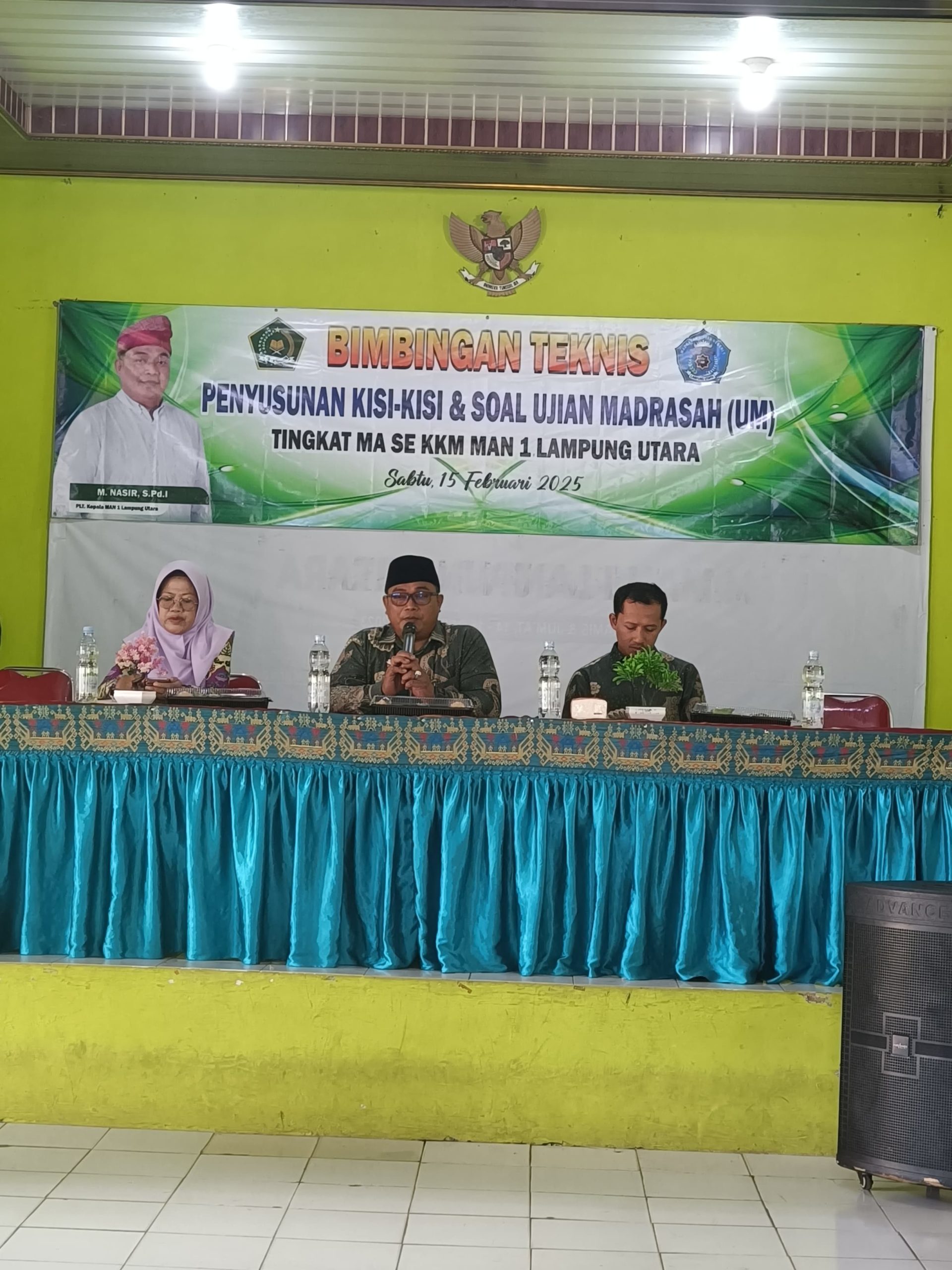 Lampung Utara, MAN 1 (Humas) – MAN 1 Lampung Utara menggelar bimtek penyusunan kisi-kisi dan soal Ujian Madrasah (UM) yang diikuti oleh guru-guru kelas XII Se-KKM MAN 1 Lampung Utara di Gedung Serba Guna setempat. Tampak hadir dalam kegiatan, Plt. Kepala MAN 1 Lampung Utara, M. Nasir, S.Pd.I, serta dua narasumber; Waka Kurikulum, Yeni Agustina, S.Pd., dan Ahmad Rosadi, M.Pd. Sabtu (15/2).