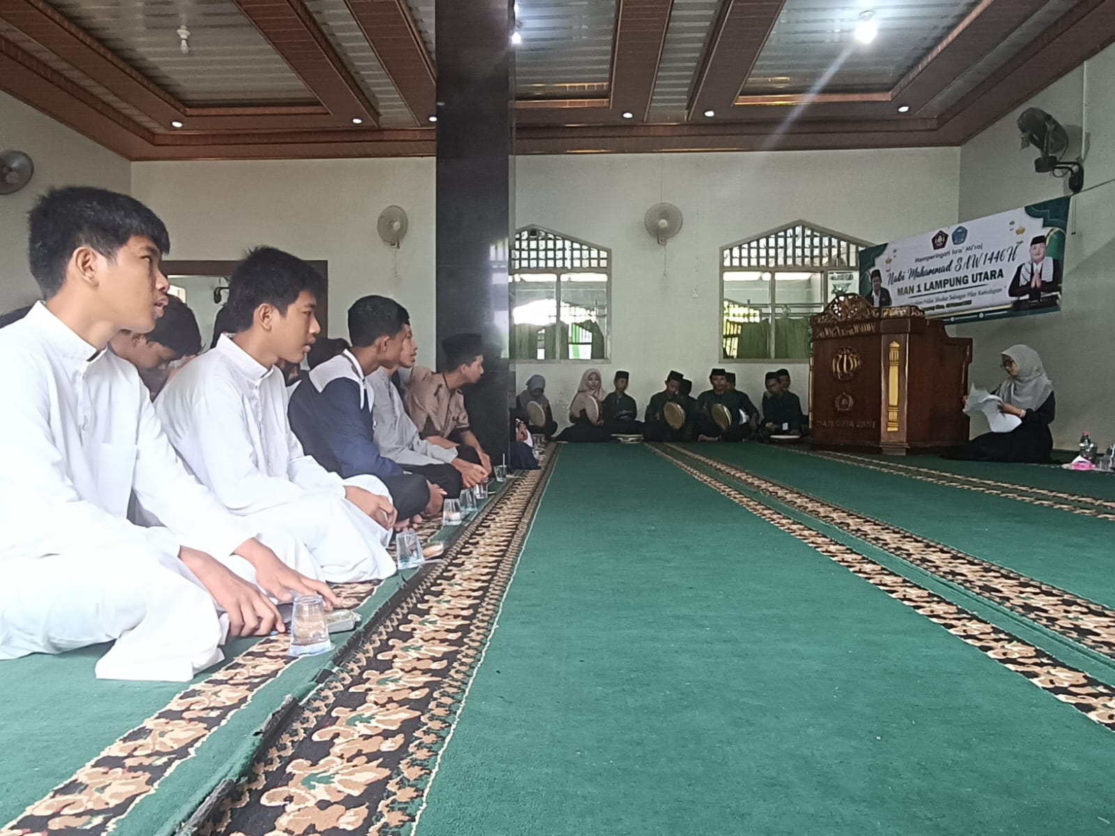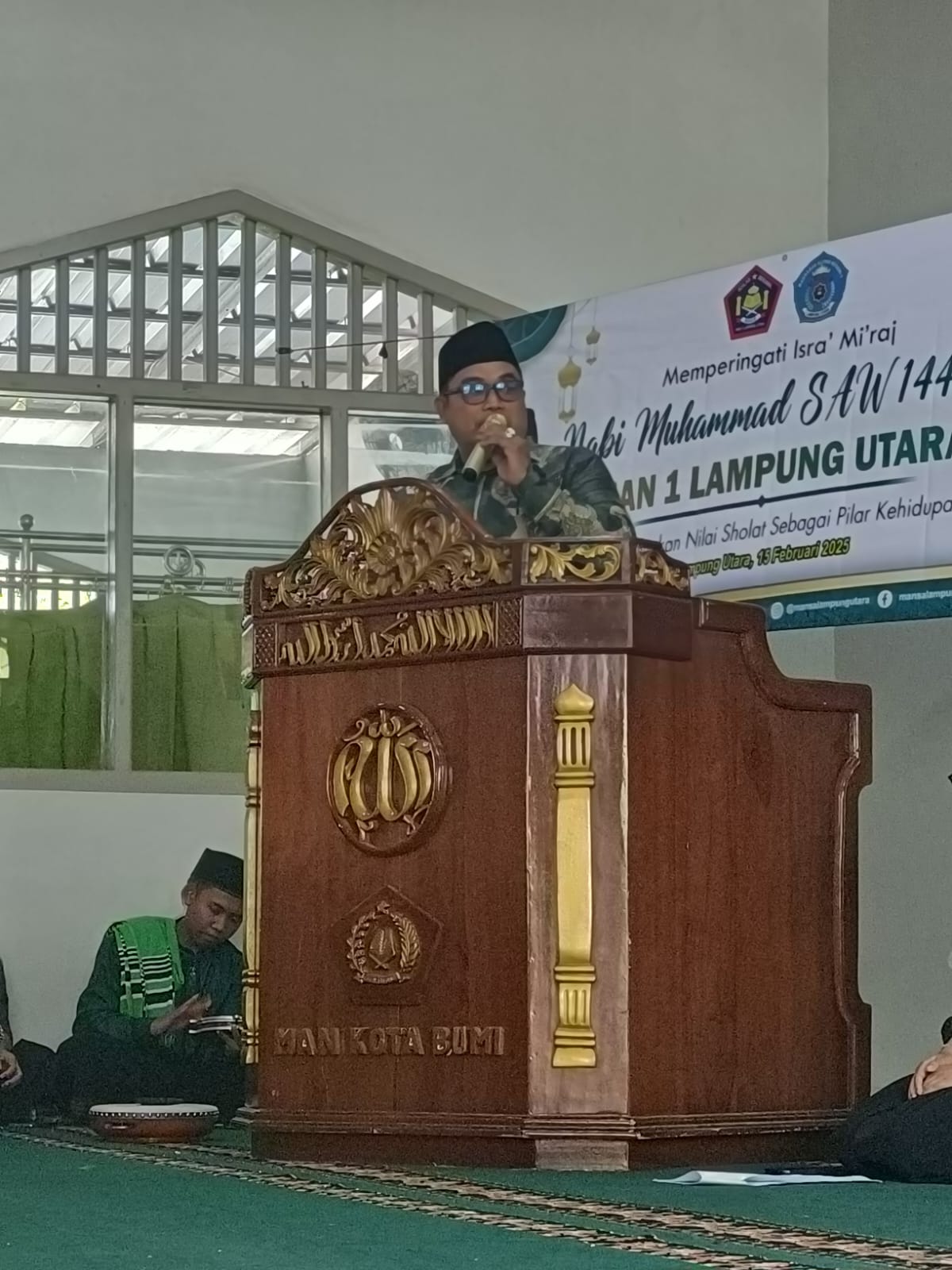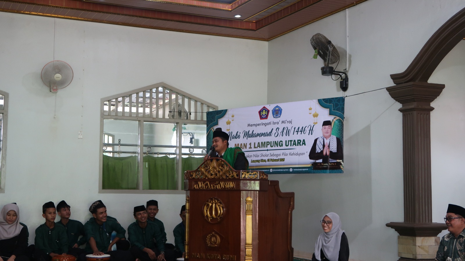 Lampung Utara, MAN 1 (Humas) – Madrasah Aliyah Negeri (MAN) 1 Lampung Utara Gelar Isra’ Miraj  Nabi Muhammad SAW 1446 H di Masjid Al-Maqsum. Tema yang diusung yakni “Menghidupkan Nilai Sholat Sebagai Pilar Kehidupan”. Kegiatan ini merupakan program madrasah tahunan dan tim keagamaan MAN 1 Lampung Utara. Kegiatan ini diawali dengan bersholawat dan diiringi marawis dari anggota rohis MAN 1 Lampung Utara. Sabtu (15/2)